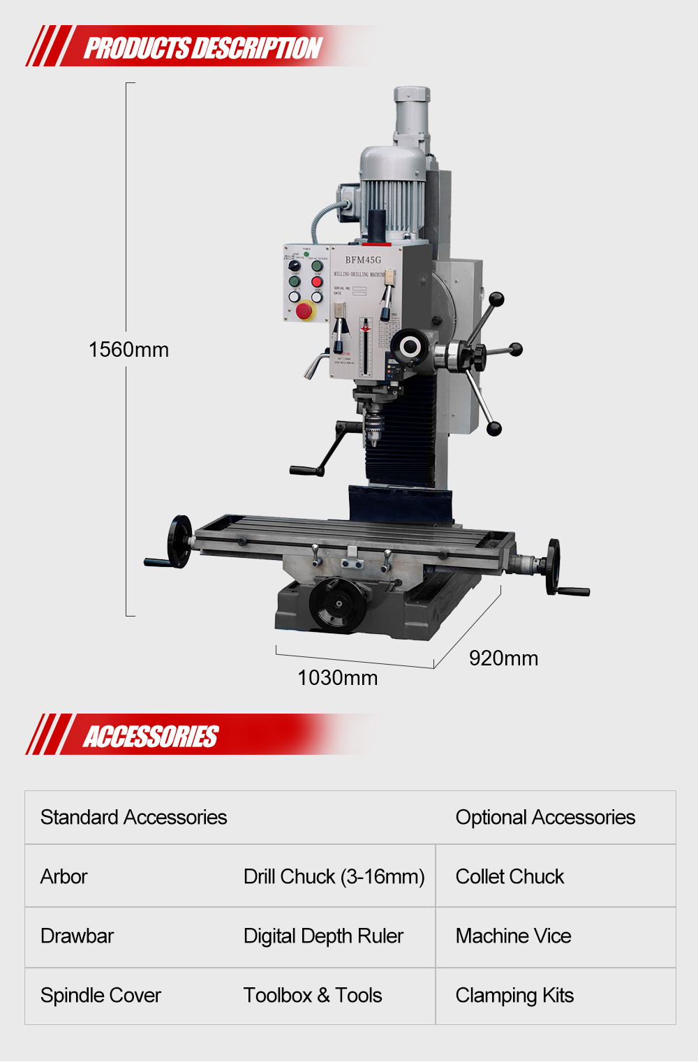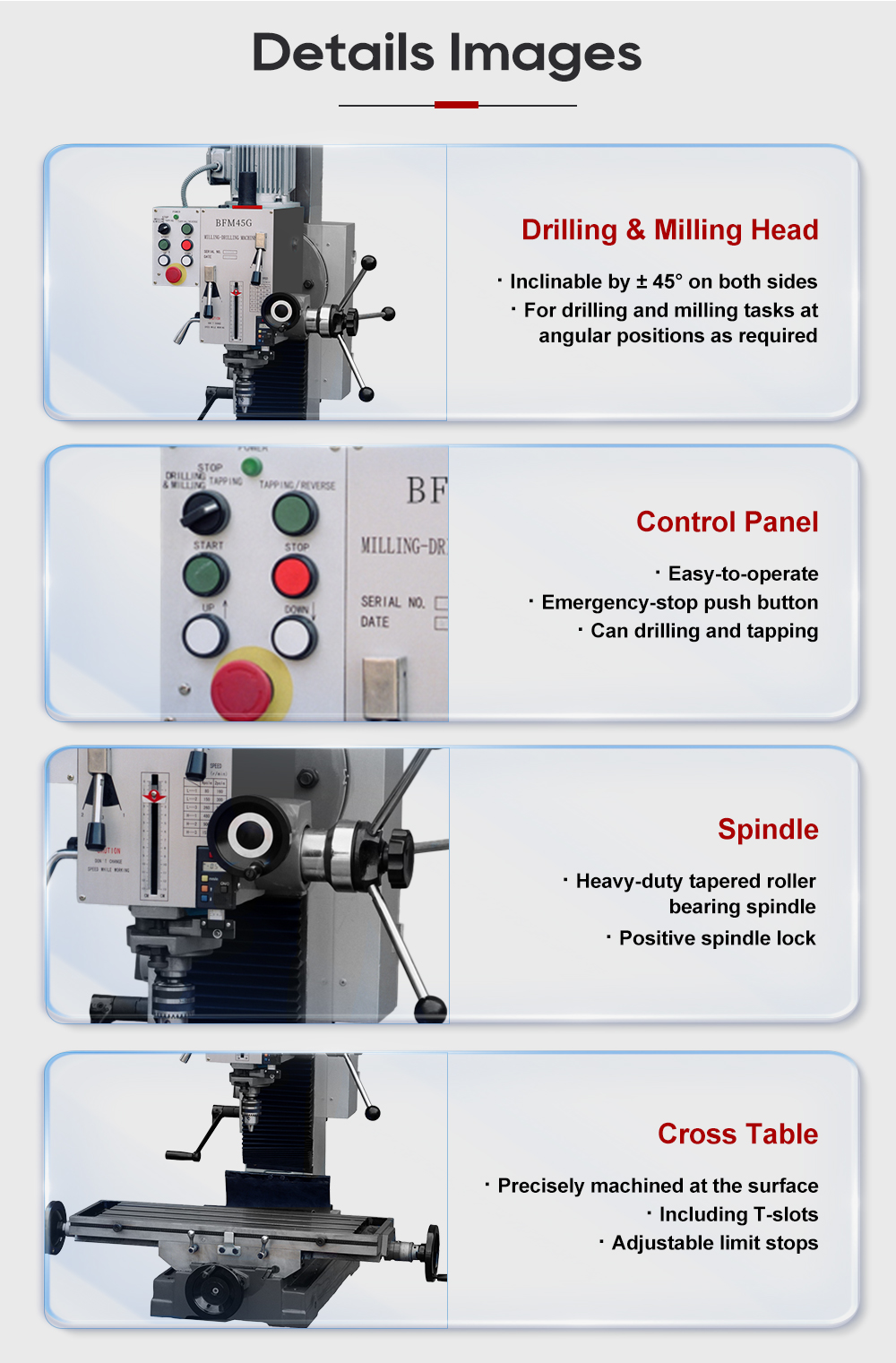 BFM45G Drilling Milling Machine Mill Drill Tool Vertical Metal Cutting Tapping Manual Product Model:BFM45G Max. Drilling Capacity: Ø45mm End Milling Capacity:Ø32mm Face Milling Capacity:Ø80mm Table Size:800x240/1000x240mm (Optional) Send Inquiry Live chat Product Detail BFM45G Drilling Milling Machine Technical Data Mill & Drill Max. drilling capacity Ø45mm End milling capacity Ø32mm Face milling capacity Ø80mm Spindle taper MT4 Spindle travel 130mm Range of spindle speed 80~1575rpm Head tilt left and right ±90° Tags: vertical milling machinevertical drilling and milling machinevertical milling machine with dro Share: PREVIOUS:JSBESTECH Company BFM45K Drilling Milling Machine NEXT:JSBESTECH Company ZX40H Drilling Milling Machine Related Products BT400 bench lathe machine price metal working lathe machine JSBESTECH Company MD3215SF-L Electric Bench Grinder Machine BT250VF all metal gear small size home use diy variable speed manual lathe machine MD3220K 200mm 220v bench grinder machine 60Hz DP16B-VS digital variable speed industrial drill press Automatic MD3220HD/762 Combo Bench Grinder Belt Sander for Workshop Use Leave a Reply Quantity: Company Name: Fax: +86 0515-88663359 8615000828330 cindy@jsbestech.com