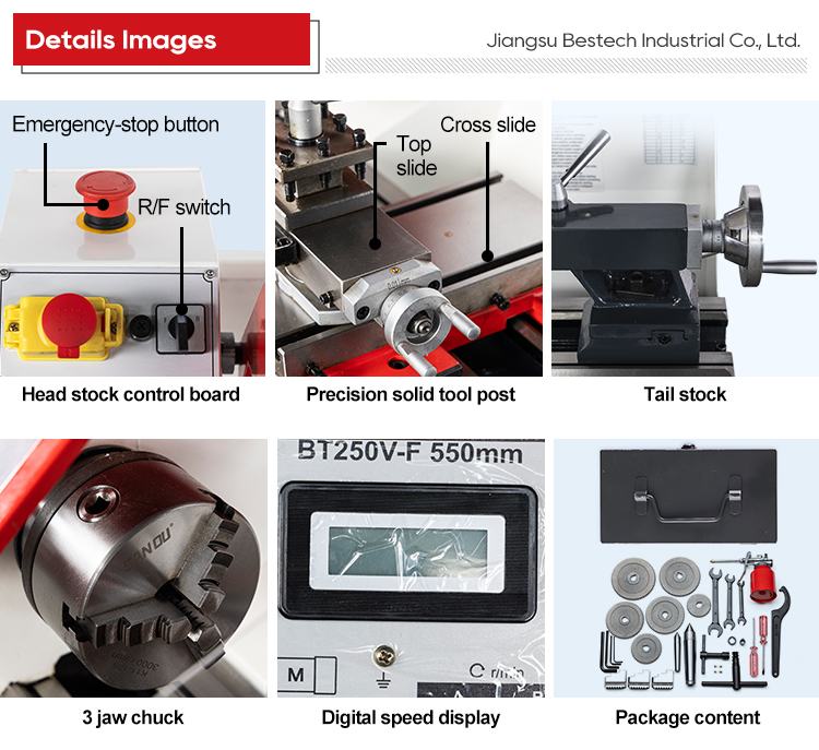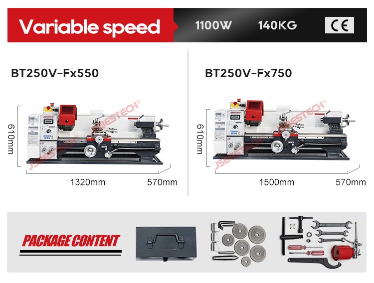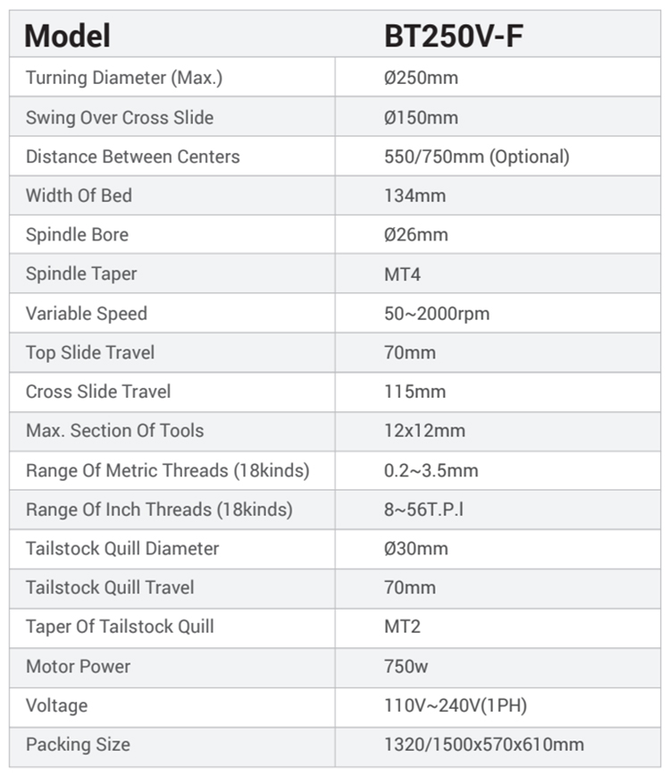 Best Value for Money BT250V-F Manual Lathe Machine for Mechanical Repair Shops Model:BT250V-F Turning Diameter (Max.):Ø250mm Swing Over Cross Slide:Ø150mm Distance Between Centers:550/750mm (Optional) Width Of Bed:134mm Spindle Bore:Ø26mm Variable Speed:50~2000rpm Tailstock Quill Diameter:Ø30mm Taper Of Tailstock Quill:MT2 Motor Power:750W N.W.:140KG Packing Size:1320/1500x570x610mm Send Inquiry Live chat Product Detail Tags: mini metal lathe machinesmall lathelathe minibench lathemanual lathe machine Share: PREVIOUS:BT250VF all metal gear small size home use diy variable speed manual lathe machine NEXT:BT230G Bench 9 Step Belt Speed Lathe Machine Related Products Torque-Rich MD-S30 Magnetic Drill Press for Shipbuilding & Marine Engineering BT290F Brushless motor metal lathe machine with milling head Manual Mini Lathe Milling Machine HQ500 Combo Lathe Milling Machine Metal Combination Lathe Milling Machine DP25B-VS Bench top drill press machine MD8103 Wet Bench Grinder for Knife Sharpener Machine ZJ5125 750W high speed pillar mini bench drill press machine for metal working