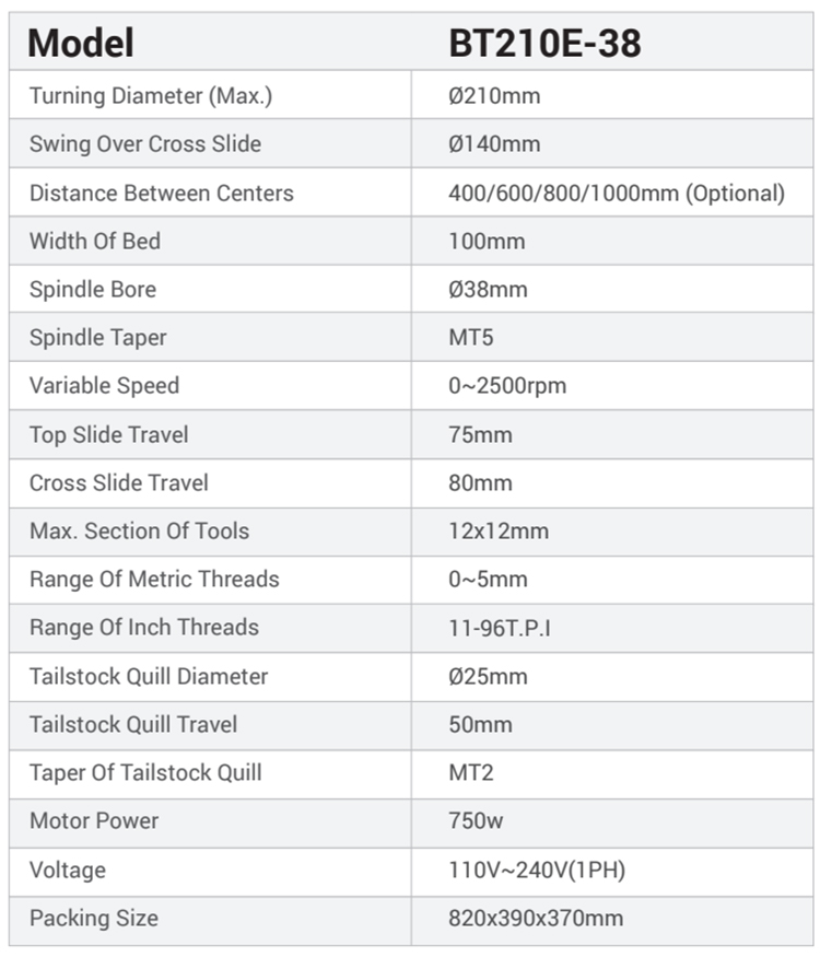 Home Essential BT210E-38 Manual Lathe for Mechanical Repair Shops Model:BT210E-38 Turning Diameter (Max.):Ø210mm Swing Over Cross Slide:Ø140mm Distance Between Centers:400/600/800/1000mm (Optional) Width Of Bed:100mm Spindle Bore:Ø38mm Variable Speed:0~2500rpm Tailstock Quill Diameter:Ø25mm Taper Of Tailstock Quill:MT2 Motor Power:750W N.W.:65KG Packing Size:820x390x370mm Send Inquiry Live chat Product Detail Tags: mini metal lathe machinesmall lathelathe minibench lathemanual lathe machine Share: PREVIOUS:BT210V-G Small mini metal 210mm 600W lathe machine NEXT:Bestech power tools 150W bench grinder motor electric heavy duty machine Related Products HQ800 Multifunction lathe metal bench lathes machine of professional manufacturer for sale JSBESTECH Company TCK50 CNC Lathe Machine High Precision MD-SY50 Magnetic Drill for Aerospace Component Fabrication High Performance MD3215E-BW Wheel Grinding Machine for Rust Removal BT290 700mm center machine torno horizontal torno manual MD150/150Q Electric Bench Grinder Machine