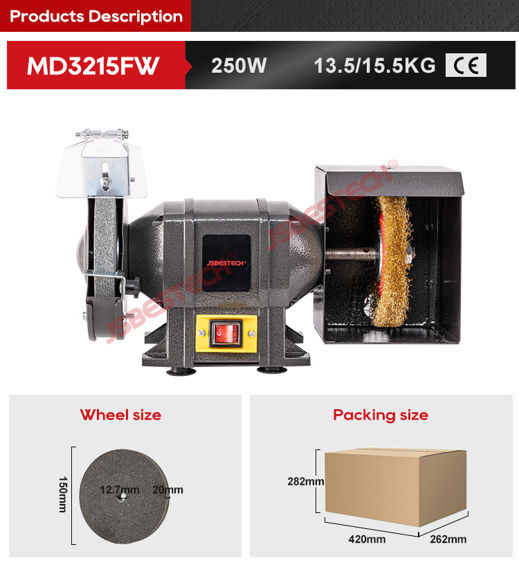 MD3215FW Industrial Electric Bench Grinder Machine 60# Grit 20mm Wheel Thickness for General Purpose Metal Polishing Motor Power:250W Motor Speed (60Hz):3450r/min Motor Speed (50Hz):2950r/min N.W./G.W.:13.5/15.5kg Packing Size:420x262x282mm Send Inquiry Live chat Product Detail Model MD3215FW Wheel Size Ø150x20xØ12.7mm Motor Power 250W Motor Speed(60Hz) 3450r/min Motor Speed(50Hz) 2950r/min Wheel Grit(left) Tags: bench grinder wheelindustrial bench grinderbench grinder polisher Share: PREVIOUS:MD3215F 6 inch Bench Grinder Motors with Steel Wheel Guard NEXT:MD3275M Electric Bench Grinder Mini Bench Grinder Machine Related Products BT280V 850W mini bench lathe machine metal High Quality 370W bench grinder variable speed with heavy cast iron base MD200BGB Long shaft powerful 200mm stationary buffing tool low speed bench polisher ZJQ5132 China cheap price 32mm mini drill press stand JSBESTECH Company BFM40 Drilling Milling Machine BT800B 800mm 11kw gap bed metal lathe machine
