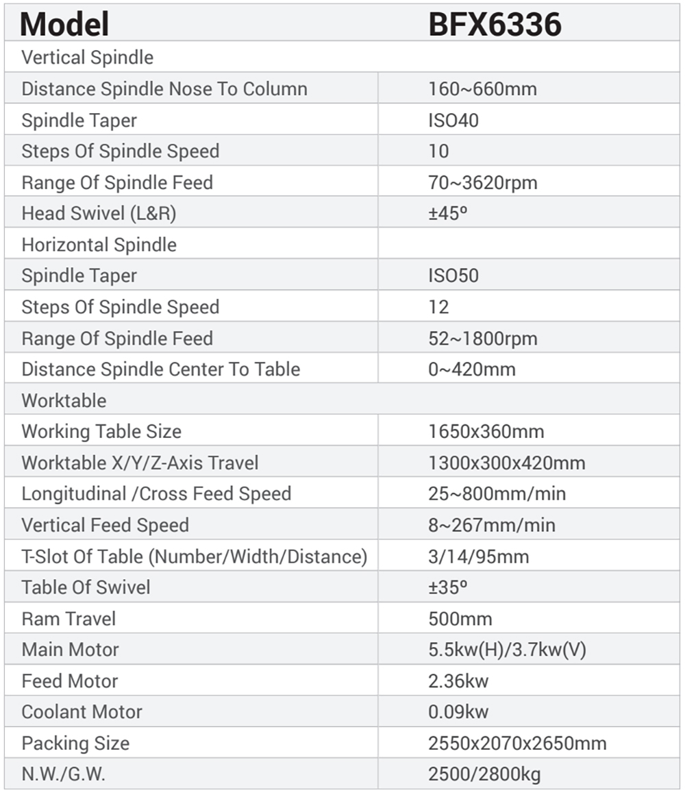 Model:BFX6336 Distance Spindle Nose To Column:160~660mm Spindle Taper:ISO40 Steps Of Spindle Speed:10 Range Of Spindle Feed:70~3620rpm Working Table Size:1650x360mm
