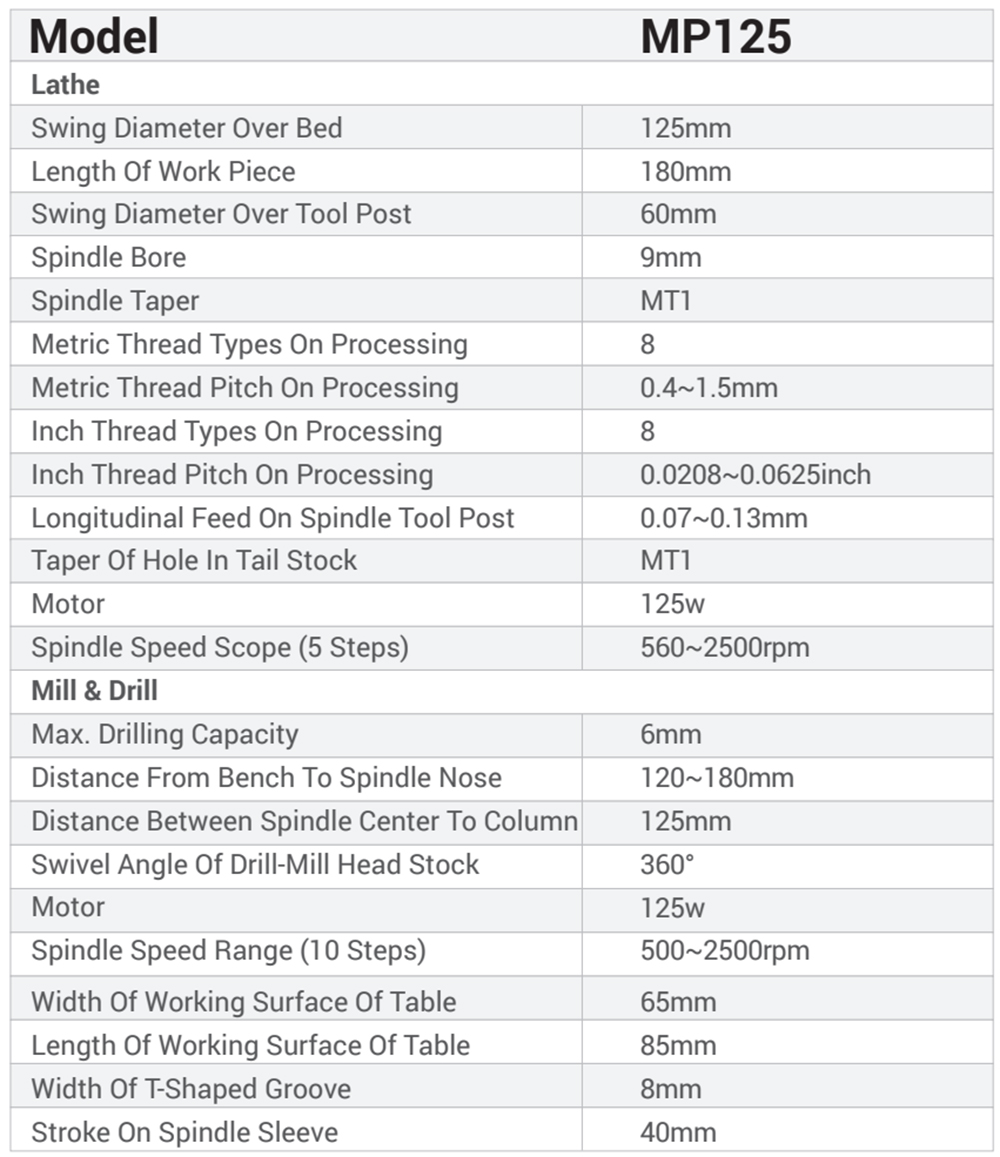 Parallel Lathe MP125 Hot Sales Multi-purpose Milling Lathe and Drilling Machine Combo Model:MP125 Swing Diameter Over Bed:125mm Length Of Work Piece:180mm Swing Diameter Over Tool Post:60mm Spindle Bore:9mm Spindle Taper:MT1 Motor:125w Send Inquiry Live chat Product Detail Tags: lathemultifunction lathedrilling milling lathebench lathemanual lathe machine Share: PREVIOUS:BT800B 800mm 11kw gap bed metal lathe machine NEXT:BT800 Metal turning lathe machine used universal horizontal lathe machine for sale Related Products MD1801 Easy accessibility hand grinding machine disc and belt sander for Wood Process BT410A High precision lathe machine in china poreba JSBESTECH Company MD3215HDA Electric Bench Grinder Machine ZJ4120 20mm 750w mini bench drill press machine for metal BT280GF Bench 8 Step Belt Speed Lathe Machine ZJ5125 750W high speed pillar mini bench drill press machine for metal working