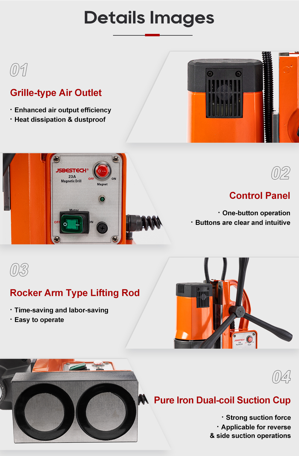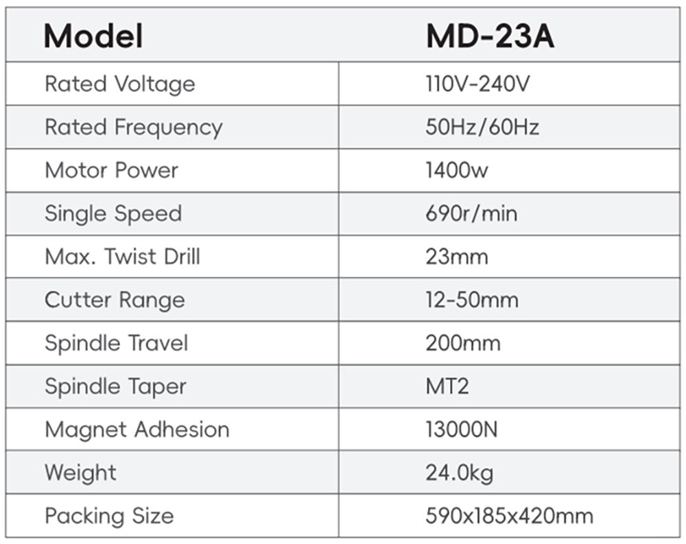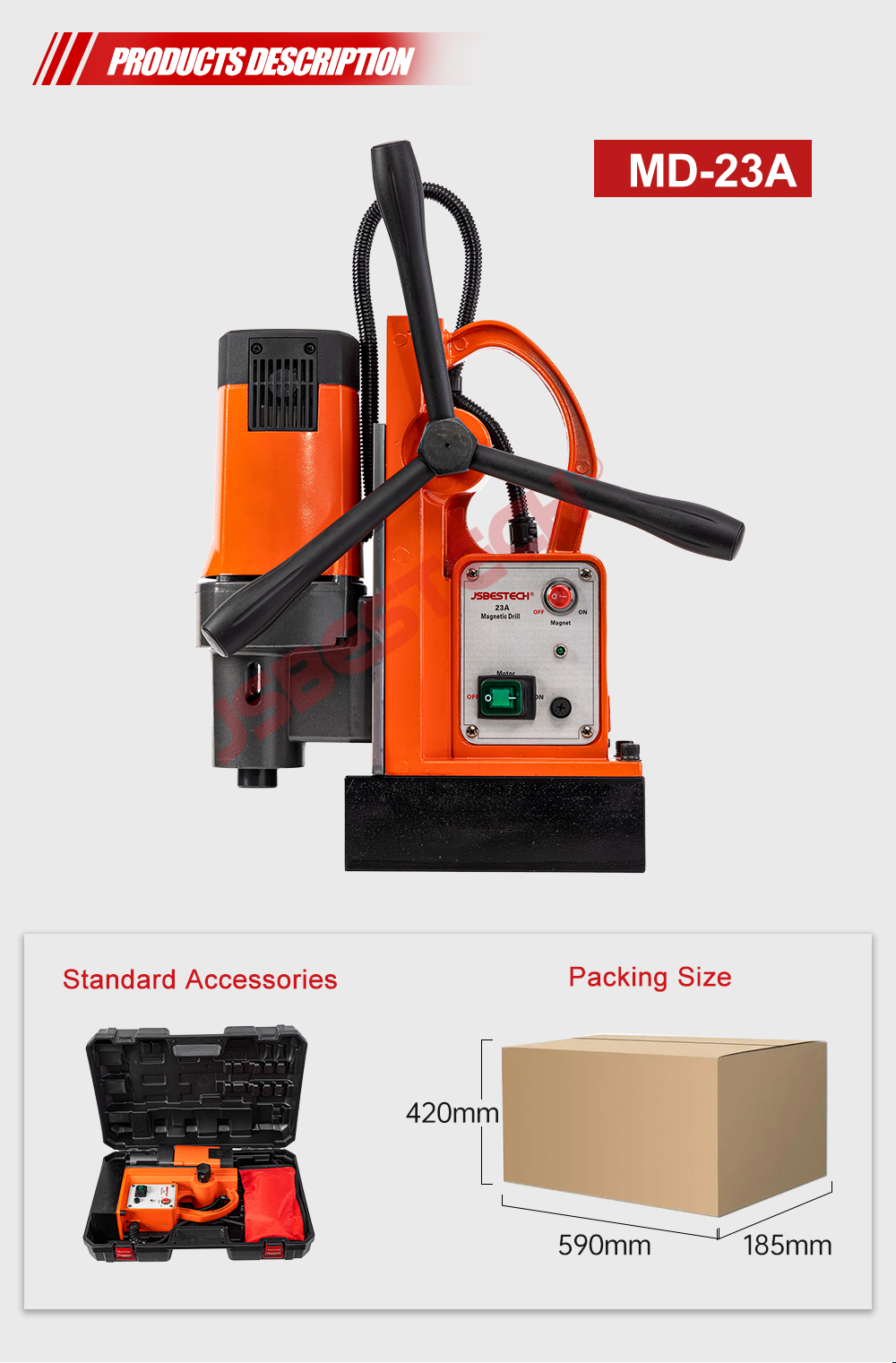 Portable MD-23A Magnetic Drill for On-Site Steel Construction Projects Model:MD-23A Rated Voltage:110V-240V Rated Frequency:50Hz/60Hz Motor Power:1400w Spindle Taper:MT2 Packing Size:590x185x420mm Send Inquiry Live chat Product Detail Tags: Magnetic Drill for On-Site Steel Construction ProjectsHobbyist Professional UseIndustrial Core Drilling Share: PREVIOUS:JSBESTECH Company VMC860 CNC Center Machine NEXT:Torque-Rich MD-S30 Magnetic Drill Press for Shipbuilding & Marine Engineering Related Products MD3220HDA-BL Bench Grinder Machine BT16 Mini bench drilling milling machine with big table size MD3215F 6 inch Bench Grinder Motors with Steel Wheel Guard High Quality 6inch 520W MD3215HD-W Grinding Wheel Machine for Metal HQ800 Multifunction lathe metal bench lathes machine of professional manufacturer for sale MD3220F Hot sale bench grinder machine price list 350w