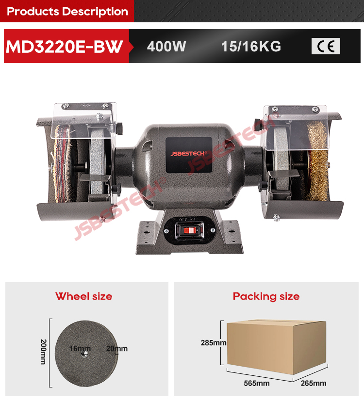 Security Guaranteed 400W MD3220E-BW Electric Grinder Tool for Grinding Model:MD3220E-BW Motor Power:400w Motor Speed (60Hz):3350r/min Motor Speed (50Hz):2950r/min N.W./G.W.:15.0/16.0kg Packing Size:565x265x285mm Send Inquiry Live chat Product Detail Model MD3220E-BW Wheel Size Ø200x20xØ16mm Brush Size Ø200x20xØ14mm Stiff Buffing Wheel Ø150x20xØ14mm Motor Power 400W Motor speed (60Hz) 3350r/min Motor speed (50HZ) 2950r/min N.W/G.W 15/16kg Packing Size 565x265x285mm Tags: High Performance Wheel Grinding MachineMulti Tool 150x20x16mm Bench Grinder Machine for Home Use Share: PREVIOUS:JSBESTECH MD3220HDA-L Electric Bench Grinder Machine NEXT:MD3220HDA Grinding Sharpening Polishing Electric Double Wheel Bench Grinder Related Products ZJ5125 750W high speed pillar mini bench drill press machine for metal working BT180V Small bench type high precision continuously variable lathe BT230G Bench 9 Step Belt Speed Lathe Machine High Quality 370W bench grinder variable speed with heavy cast iron base PM200 polishing machine polisher bench grinder Z5032 portable drilling machine for sale philippines up right drill press